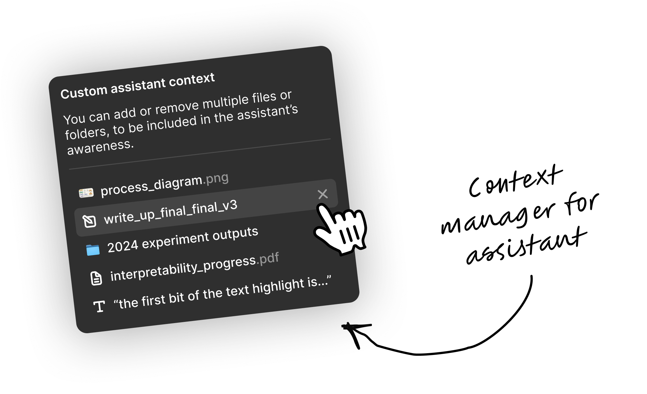 To set an individual item as context, just right-click it, or select the item withCtrl+click. You can then choose to Add to Assistant context which adds it to whatever is the current context – you can add multiple things progressively in this way.